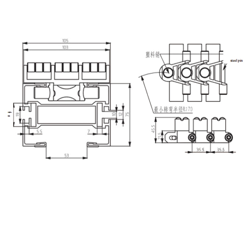 Pitch(mm) Pin Diameter(mm) Curl Radius R(Min.)mm Suitable for larger items, especially when the balance point is off-center, with higher load-bearing capacity; such as large ball bearings, turbine rotors, seat belt brackets, motor steering arm components, boxes, etc.