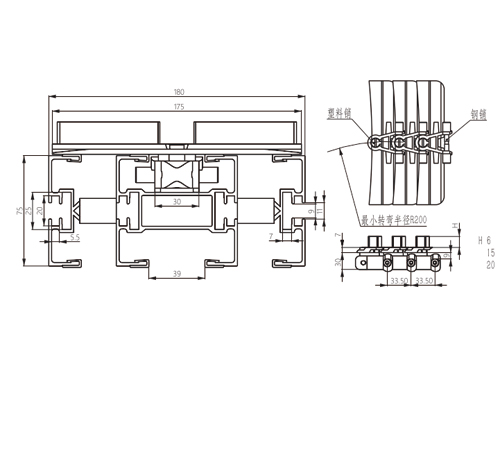 Pitch(mm) Pin Diameter(mm) Curl Radius R(Min.)mm The chain conveyor travels along four guide rails. It features a curved rail and side-bending safety chain. Compact horizontal and vertical bends; suitable for flexible packaging, large cardboard, soft plastics, and other products. Examples include: laundry detergent, packaging paper tubes, food, and personal care products.
