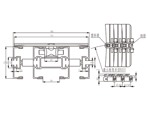 | Pitch(mm) | Pin Diameter(mm) | Curl Radius R(Min.)mm | The chain conveyor travels along four guide rails. It features a curved rail and side-bending safety chain. Compact horizontal and vertical bends; suitable for flexible packaging, large cardboard, soft plastics, and other products. Examples include: laundry detergent, packaging paper tubes, food, and personal care products. | |||