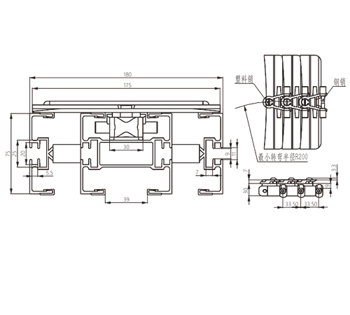 | Pitch(mm) | Pin Diameter(mm) | Curl Radius R(Min.)mm | The chain conveyor travels on four guide rails. It features a curved rail and side-bending safety chain. Compact horizontal and vertical bends; suitable for flexible packaging, large cardboard, soft plastics, and other products. Examples include laundry detergent, packaging paper tubes, food, and personal care products. The adhesive-coated surface provides anti-slip properties, allowing for lifting and conveying of puffed, lightweight packaging products within a 35-degree angle. | |||