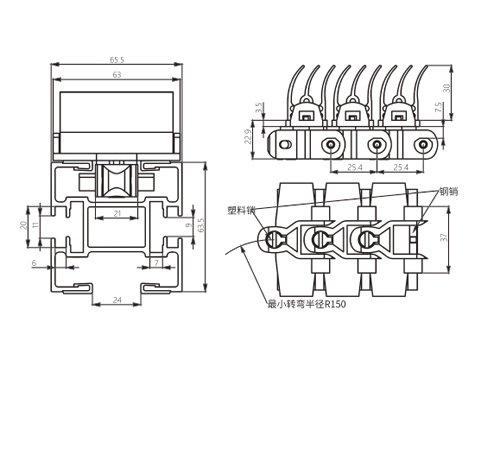 | Pitch(mm) | Pin Diameter(mm) | Curl Radius R(Min.)mm | Flexible wedge chains are used for vertical transport in vertical lateral conveyor systems. They are suitable for conveying products such as glass and plastic bottles, soft drink cans, and cardboard boxes. Two sets of conveyor systems with flexible wedge chains are installed facing each other to form a vertical lateral conveyor system. | |||