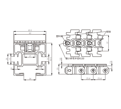 | Pitch(mm) | Pin Diameter(mm) | Curl Radius R(Min.)mm | It is mainly suitable for conveying food, beverages and various other items. The special design of the pin installation makes it easy to disassemble and is safe and reliable. | |||