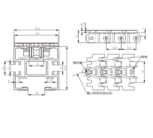 | Pitch(mm) | Pin Diameter(mm) | Curl Radius R(Min.)mm | Used for conveying items on inclined conveyor lines, with a durable, wear-resistant, non-slip rubber coating. | |||