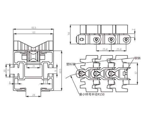 Pitch(mm) Pin Diameter(mm) Curl Radius R(Min.)mm The special V-shaped material block design ensures that the conveyed material is centered and effectively prevents it from slipping and falling.