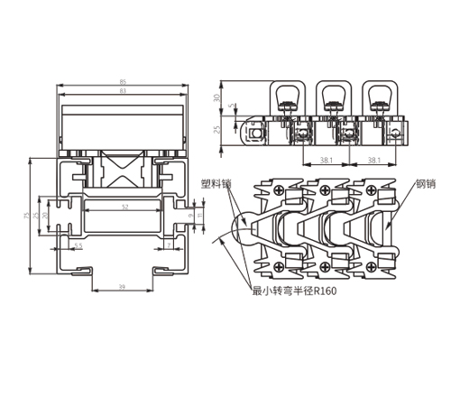 Pitch(mm) Pin Diameter(mm) Curl Radius R(Min.)mm Flexible wedge chains are used for vertical transport in vertical lateral conveyor systems. They are suitable for conveying products such as glass and plastic bottles, soft drink cans, and cardboard boxes. Two sets of conveyor systems with flexible wedge chains are installed facing each other to form a vertical lateral conveyor system.